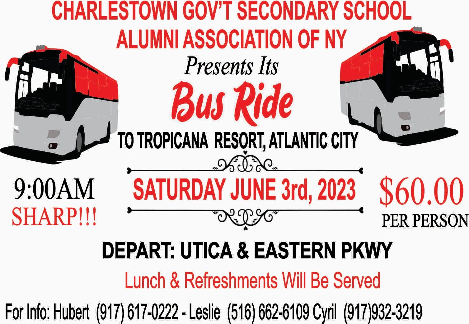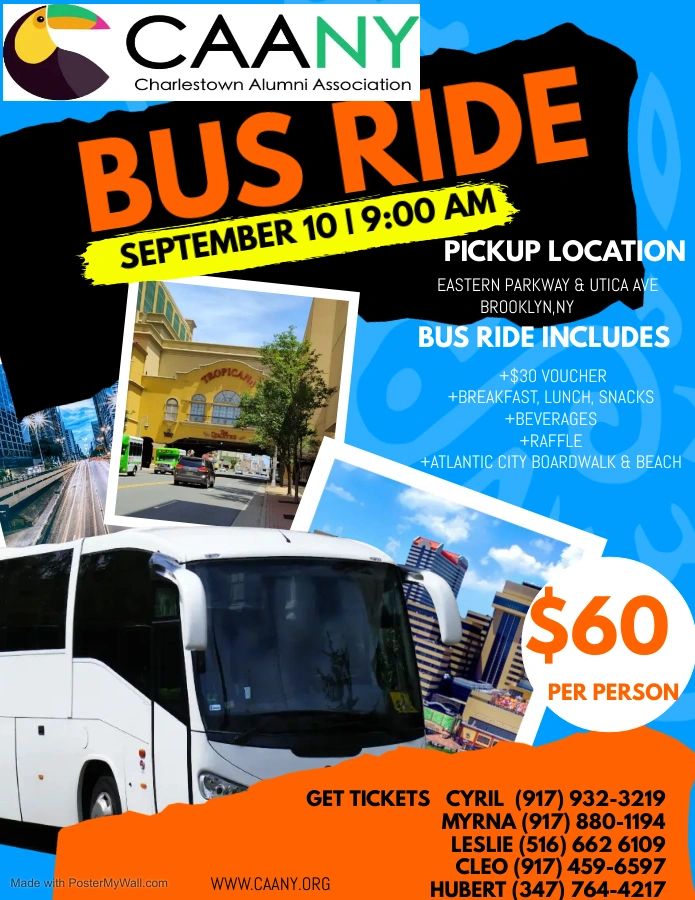CAANY is having its 3rd Annual Bus Ride to TROPICANA RESORT, Atlantic City. Participants will be issued a $30 Voucher upon arrival at TROPICANA. All proceeds are used to support our Annual Edgar M. Wilson Scholarship and other programs to benefit the Students at CSS. Call any phone# on the flyer for tickets.