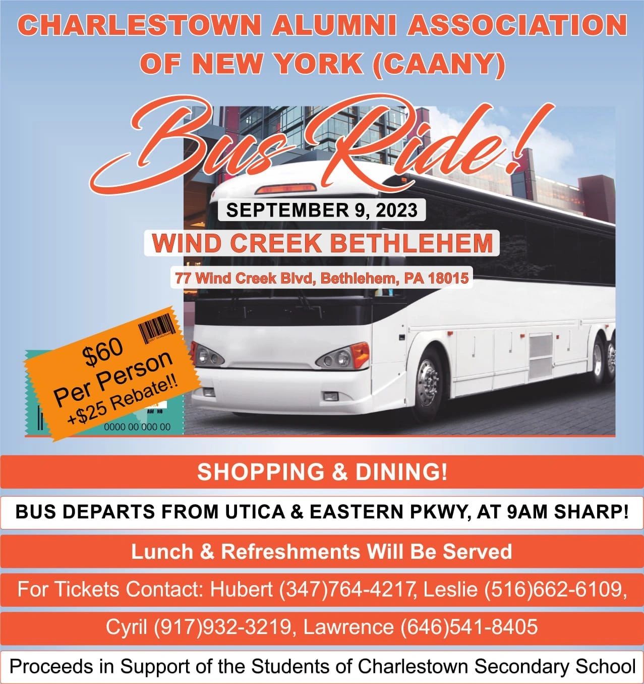 CAANY is having its fundraising Bus Ride to Wind Creek Bethlehem, PA on 9/09/2023. All participants will be issued a $25 Voucher upon arrival at the Resort. All proceeds are used to support our Annual Edgar M. Wilson Scholarship and other programs to benefit the Students at CSS. Call any phone# on the flyer for tickets